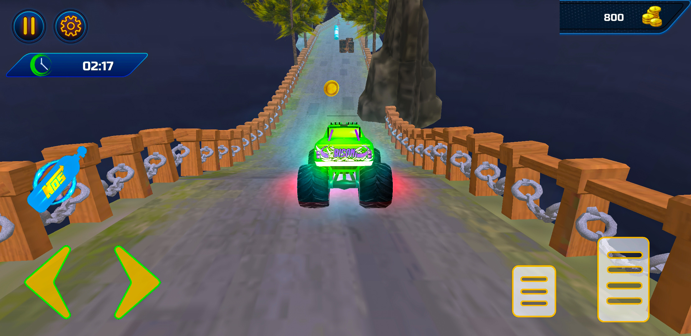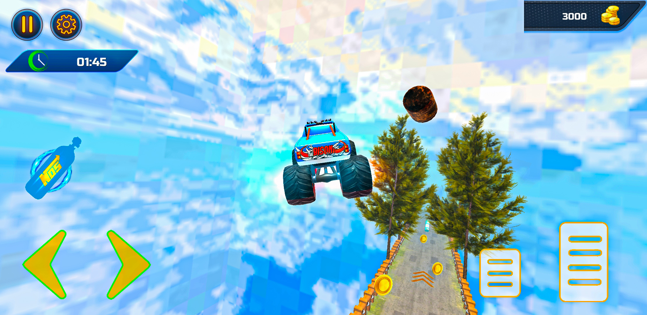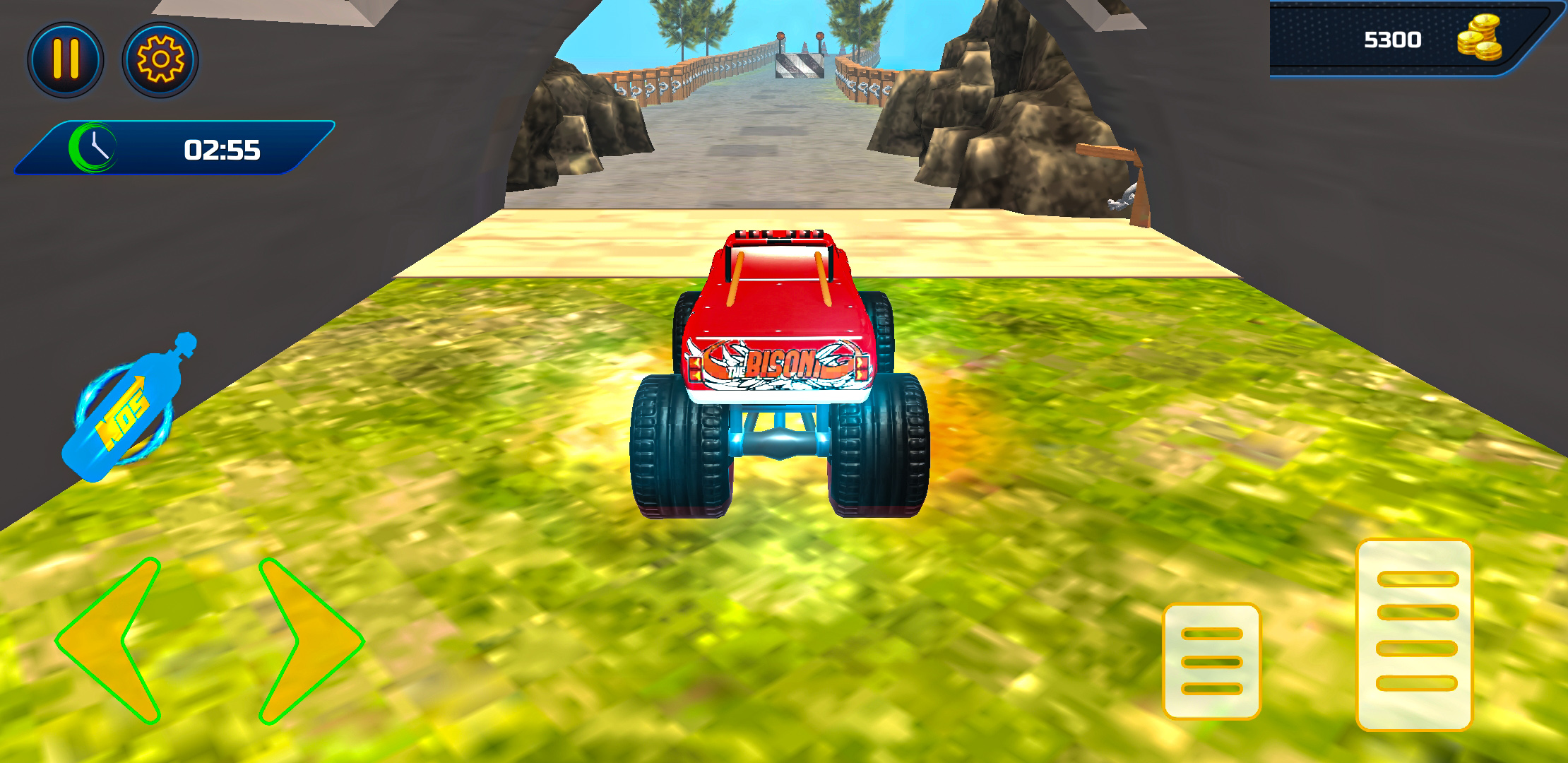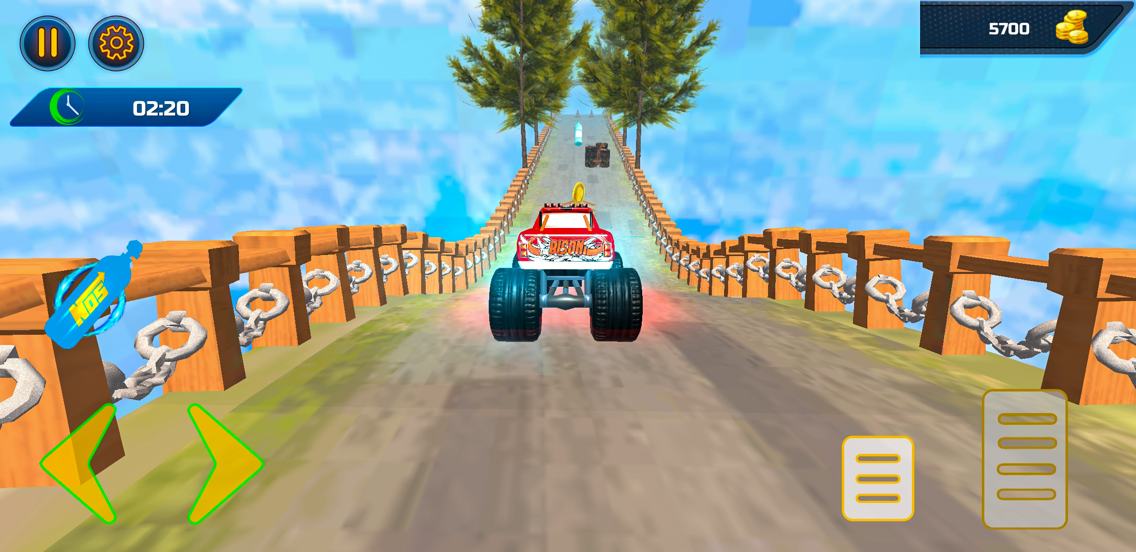 Welcome to the mountain stunts racing car game with a ramp for impossible monster truck stunts.